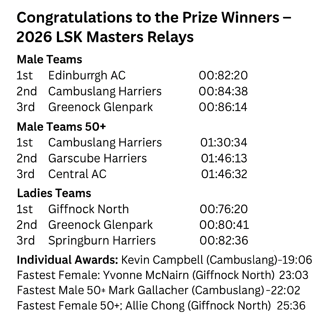 The Annual LSK Masters Open Road Relays will take place on Sunday 25th January 2026 at Strathclyde Park, 366 Hamilton Road, Motherwell ML1 3ED.